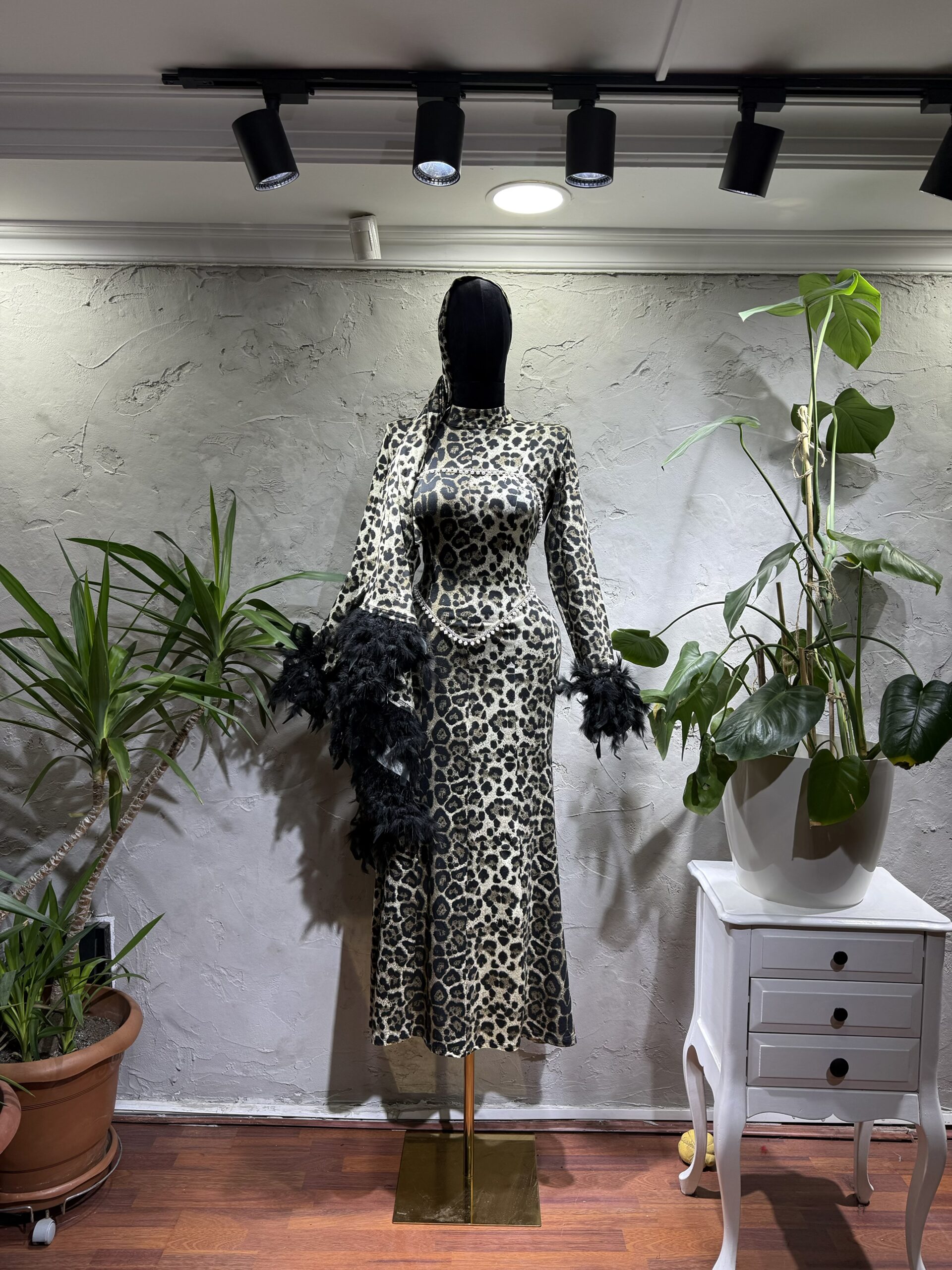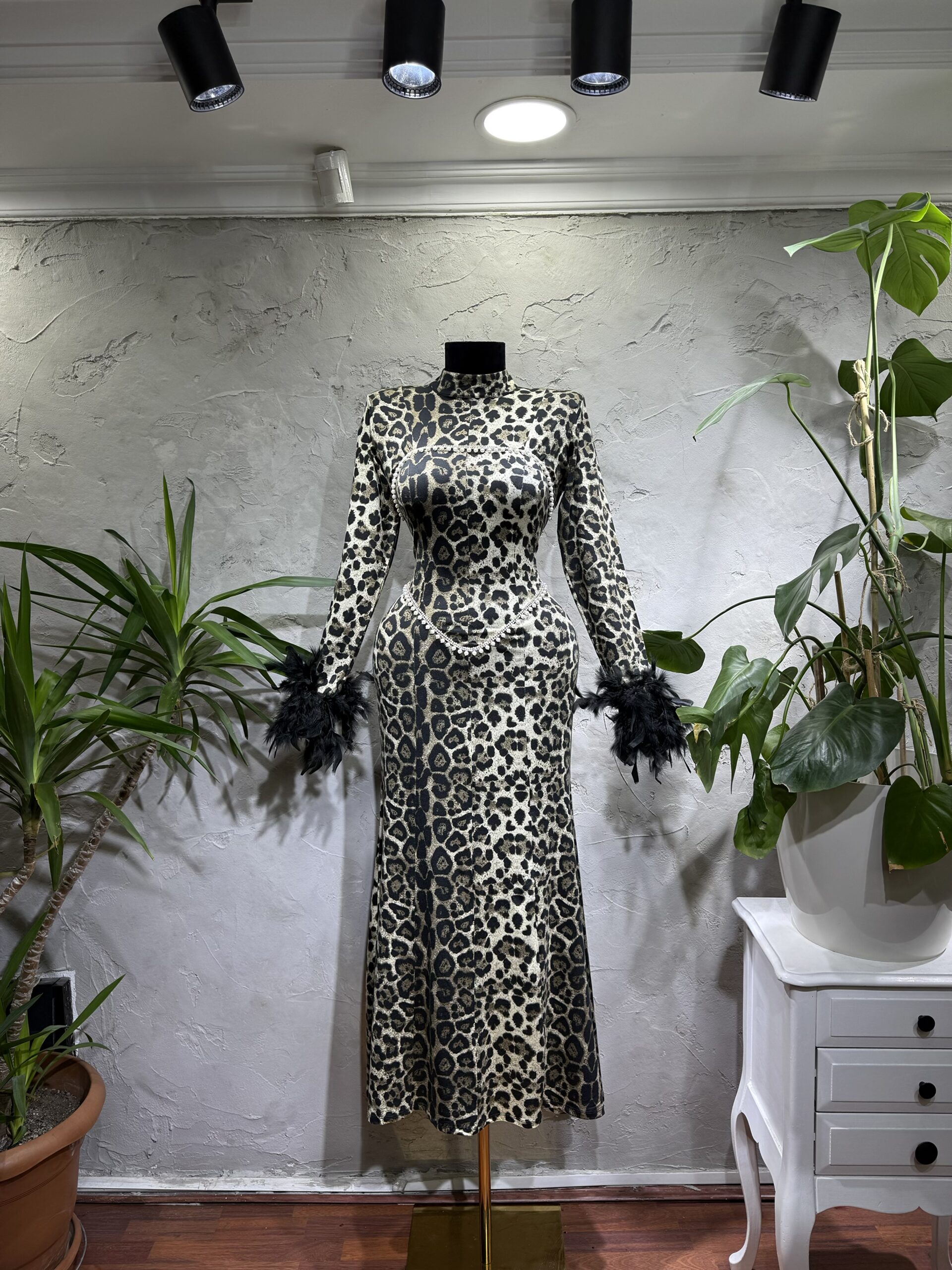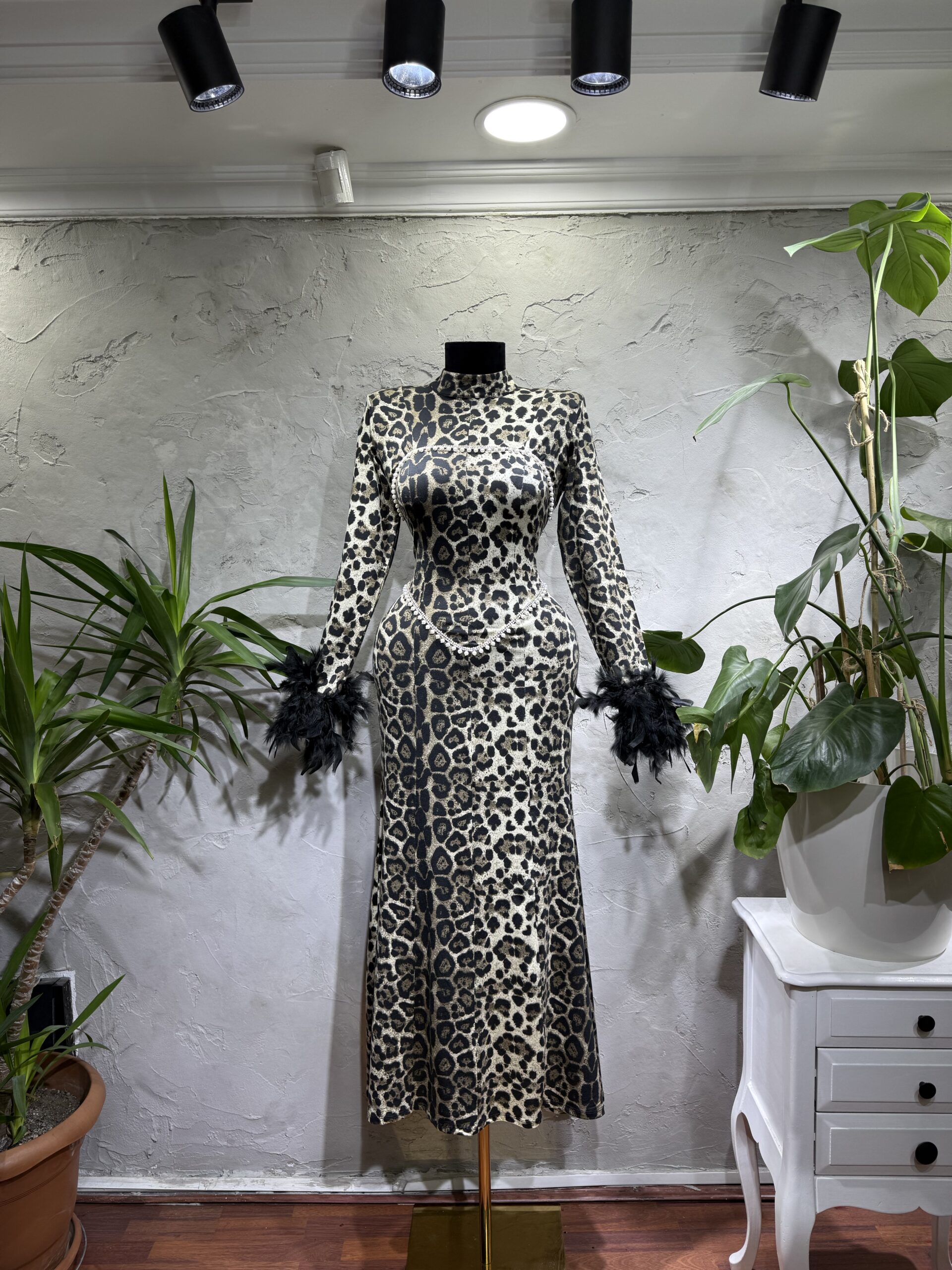 Pamuk Viskon Kumaştan Leopar Desenli Tasarım Elbise