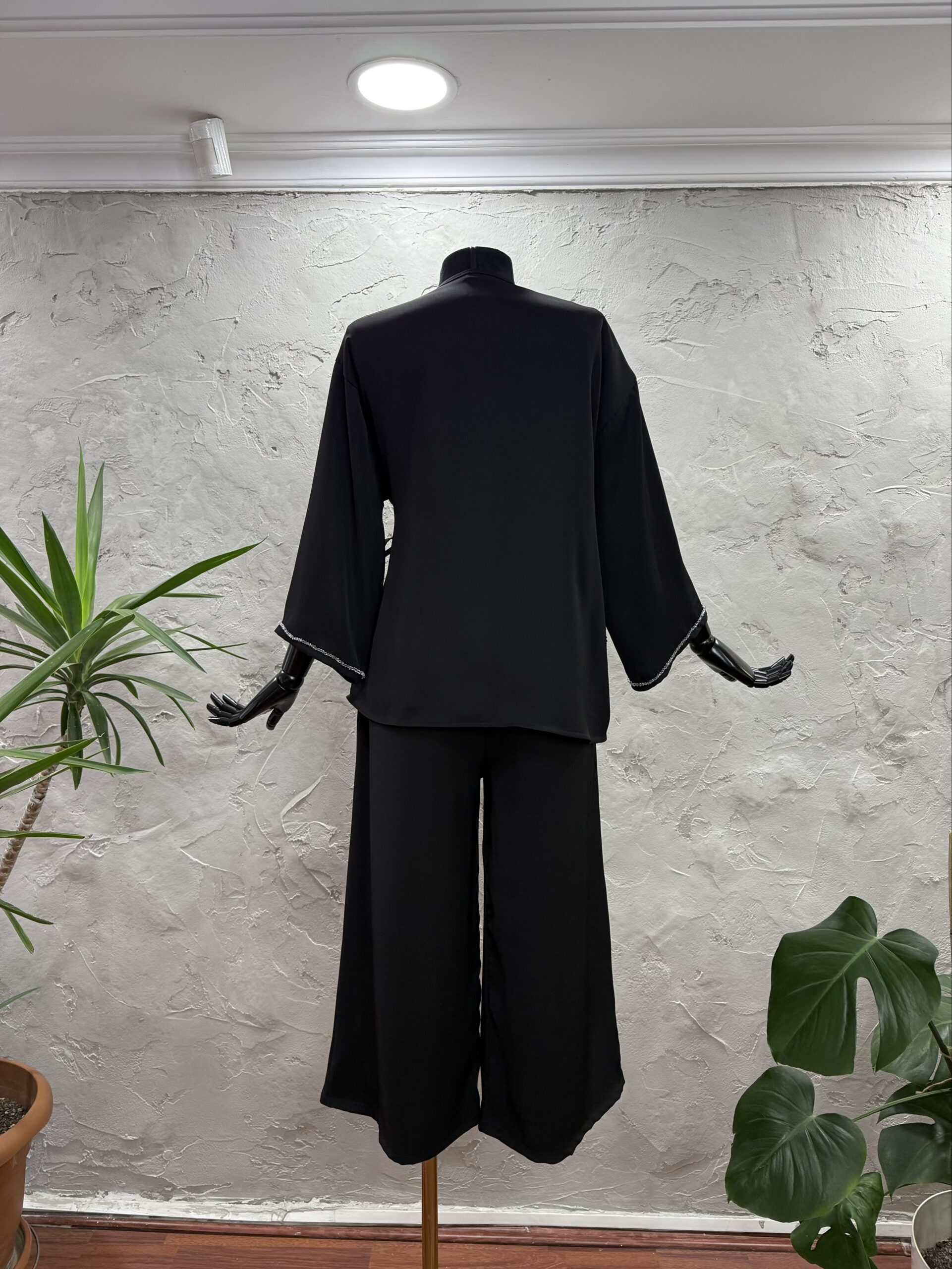 •Kimono kuşaklı gömlek ve Bol paça pantolondur.