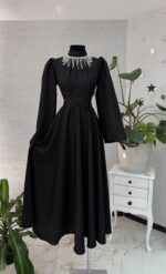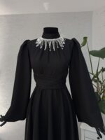 •Yaka detayındaki kristal taş şerit detayı el işlemesidir.